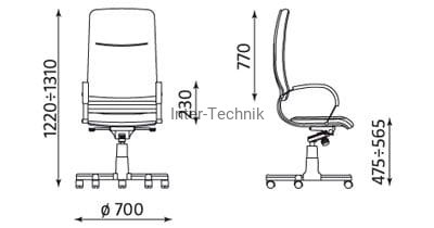 Podnośnik pneumatyczny zapewnia miękkie resorowanie oraz płynną regulację wysokości siedziska w zakresie ok. 100 mm. Podstawa jezdna metalowa (aluminium polerowane), wyposażona w standardzie w pięć kółek do wykładzin dywanowych.