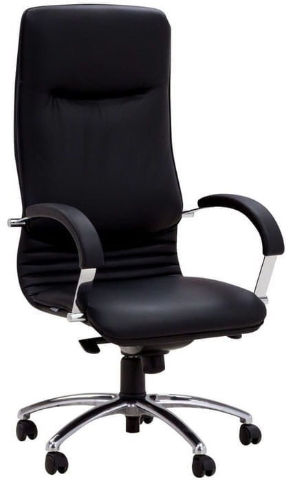 Fotel dyrektorski obrotowy. Szkielet siedziska wykonany ze sklejki drewnianej, profilowanej anatomicznie, tapicerowany pianką tapicerską oraz wysokogatunkową skórą LICOWĄ (front w skórze, tył w imitacji skóry tego samego koloru).