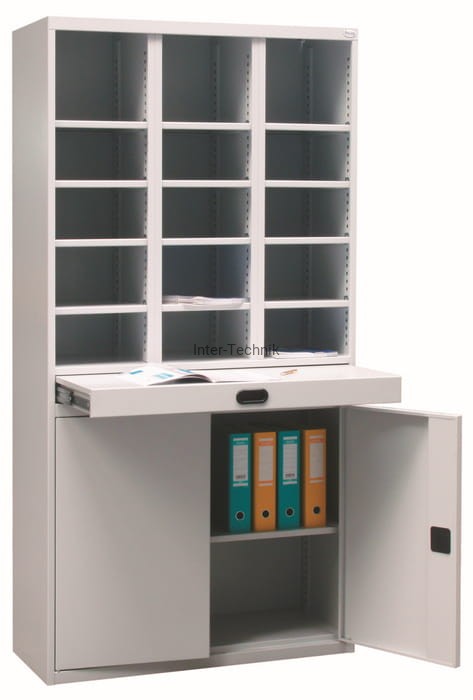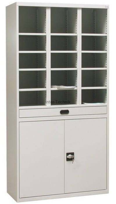 Szafka do sortowania i przechowywania dokumentów, poczty. Półki można dowolnie przestawiać w odstępach co 25 mm, wysuwana półka zamontowana na mocnych prowadnicach, dolna szafka wyposażona w przestawną półkę na segregatory i inne dokumenty.
