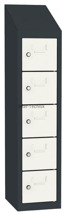 Szafka śniadaniowa ze skośnym daszkiem. Szafa wykonana z blachy czarnej o grubości 0,8 mm malowanej proszkowo, wieniec dolny ocynkowany. Możliwość zawieszenia na ścianie. W ścianach bocznych otwory do skręcania szafek ze sobą. Drzwi gładkie z wizytownikiem, zamykane na zamek cylindryczny z 2 kluczami.