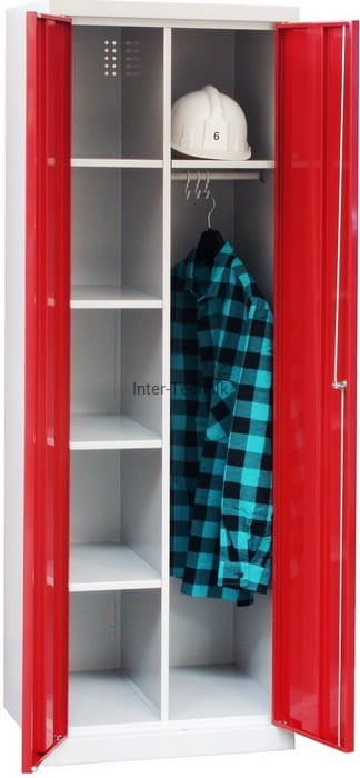 Szafka socjalna – gospodarcza zamykana zamkiem cylindrycznymi z ryglowaniem w 2 punktach. Szafka wyposażona wewnątrz lewego segmentu – w 4 półki, wewnątrz prawego segmentu – w górną półkę, poniżej w drążek z 3 przesuwanymi wieszakami na ubranie.